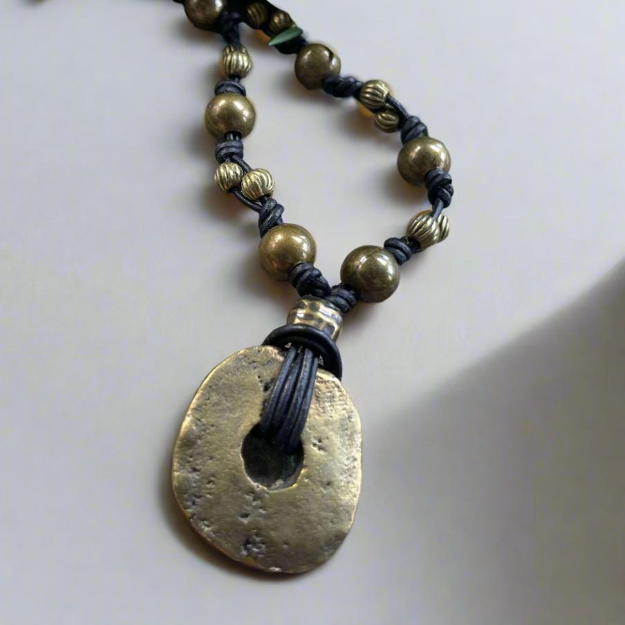 Wear this necklace and add a little brass to your sass! You'll be stung with style when you drape our brass medallion necklace on your neck, adorned with brass beads and strung on leather.