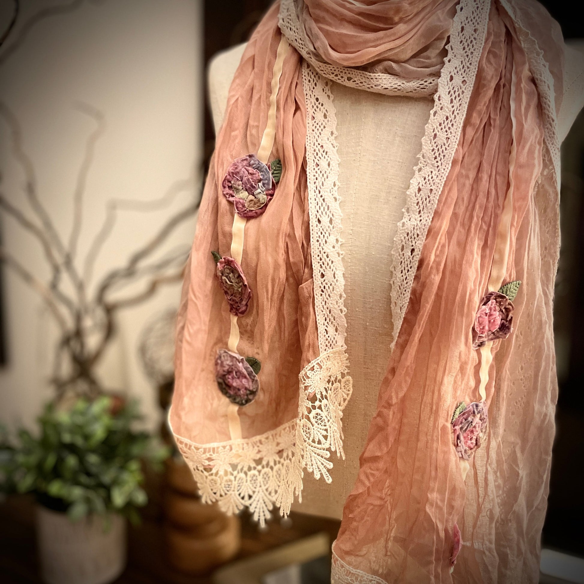 Elevate your everyday style with this lightweight, elegant scarf, designed for year-round wear. Hand-dyed velvet ribbon brings a vintage-inspired charm, echoing timeless fashion. Each scarf is uniquely handcrafted, offering a one-of-a-kind accessory that adds sophistication to any outfit. Pair it with jeans and a white tee for a chic daytime look, or with a simple black dress for an effortless evening look.