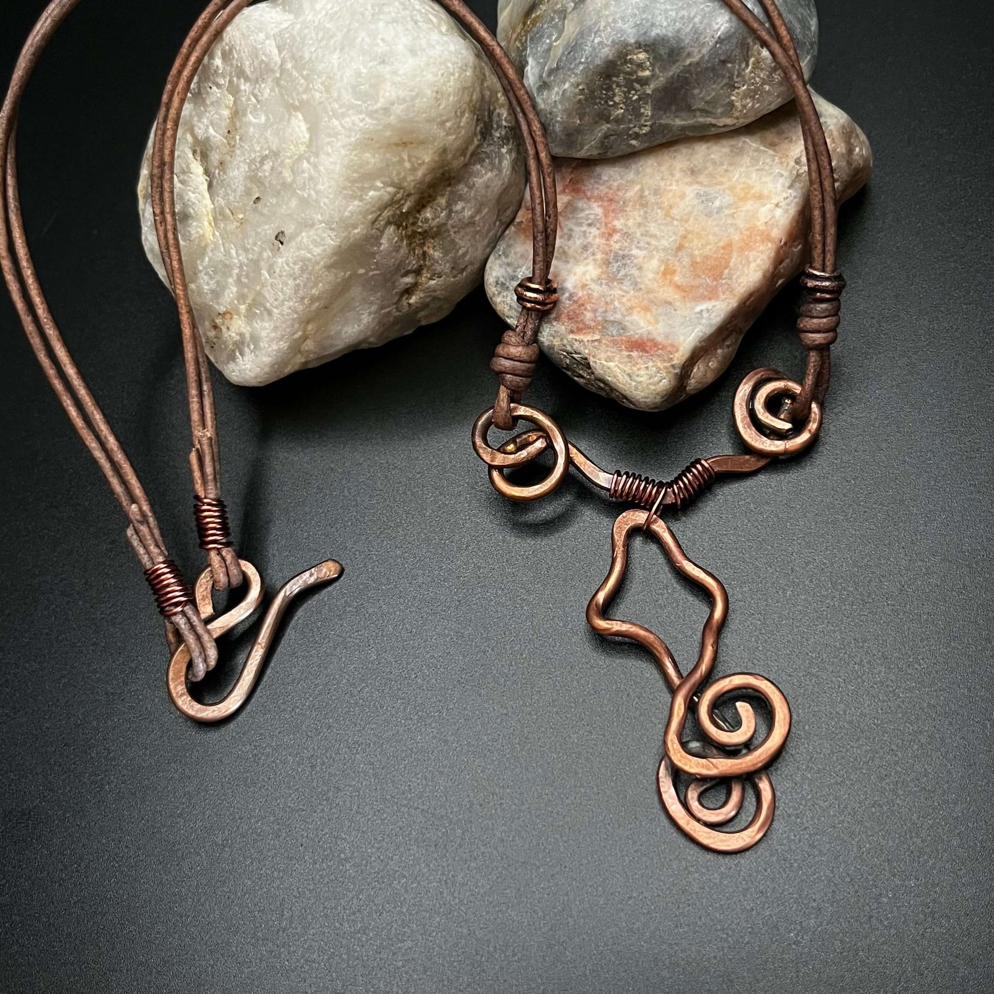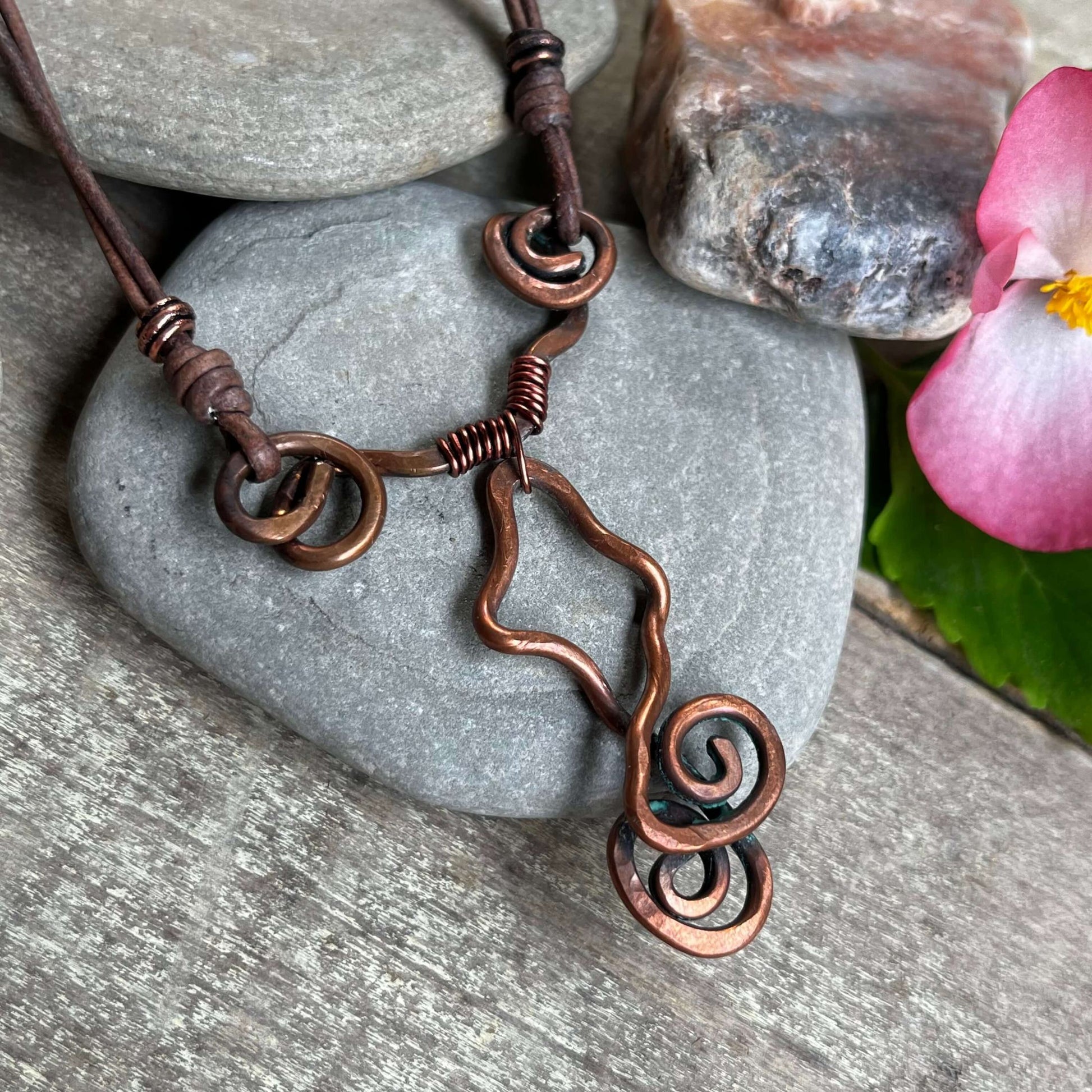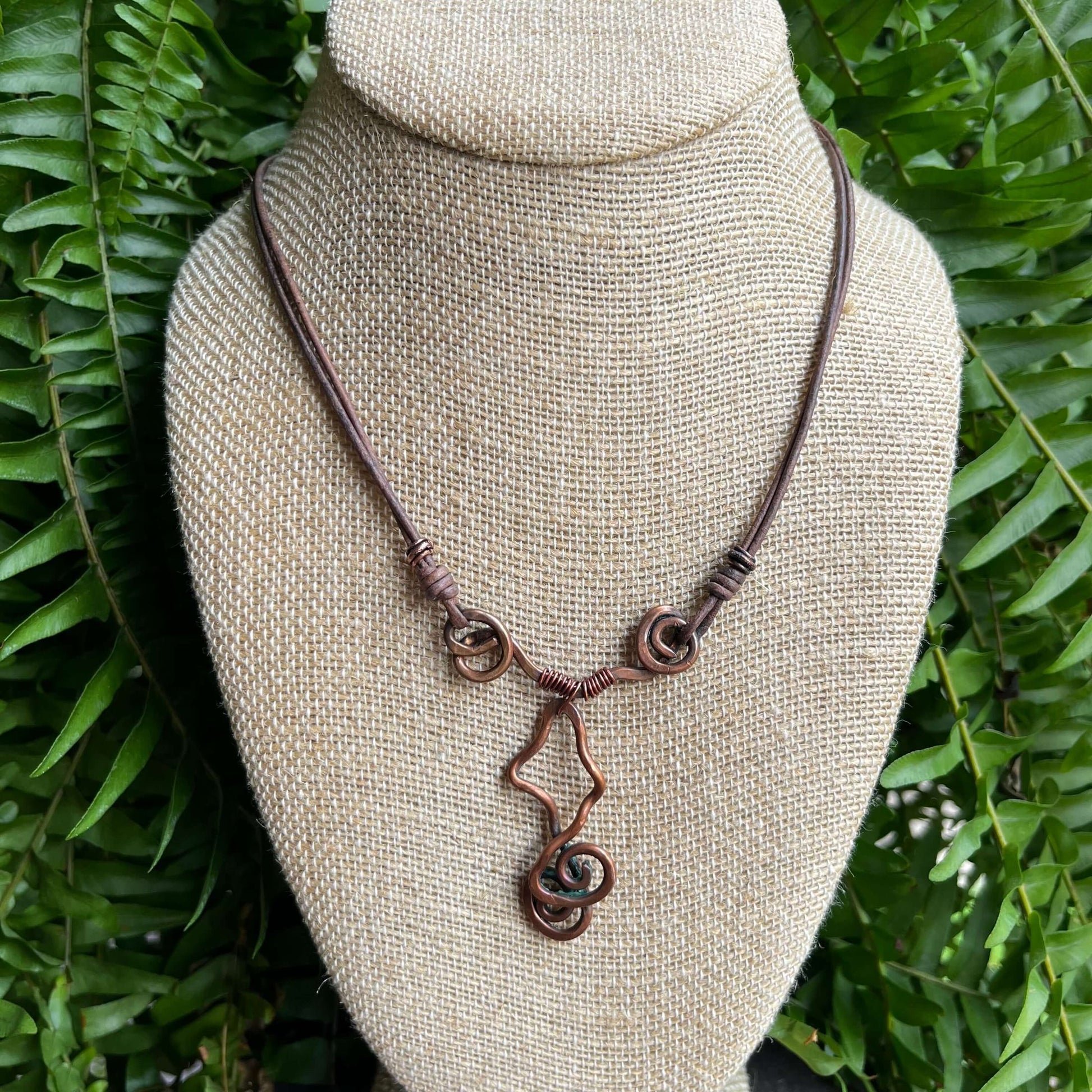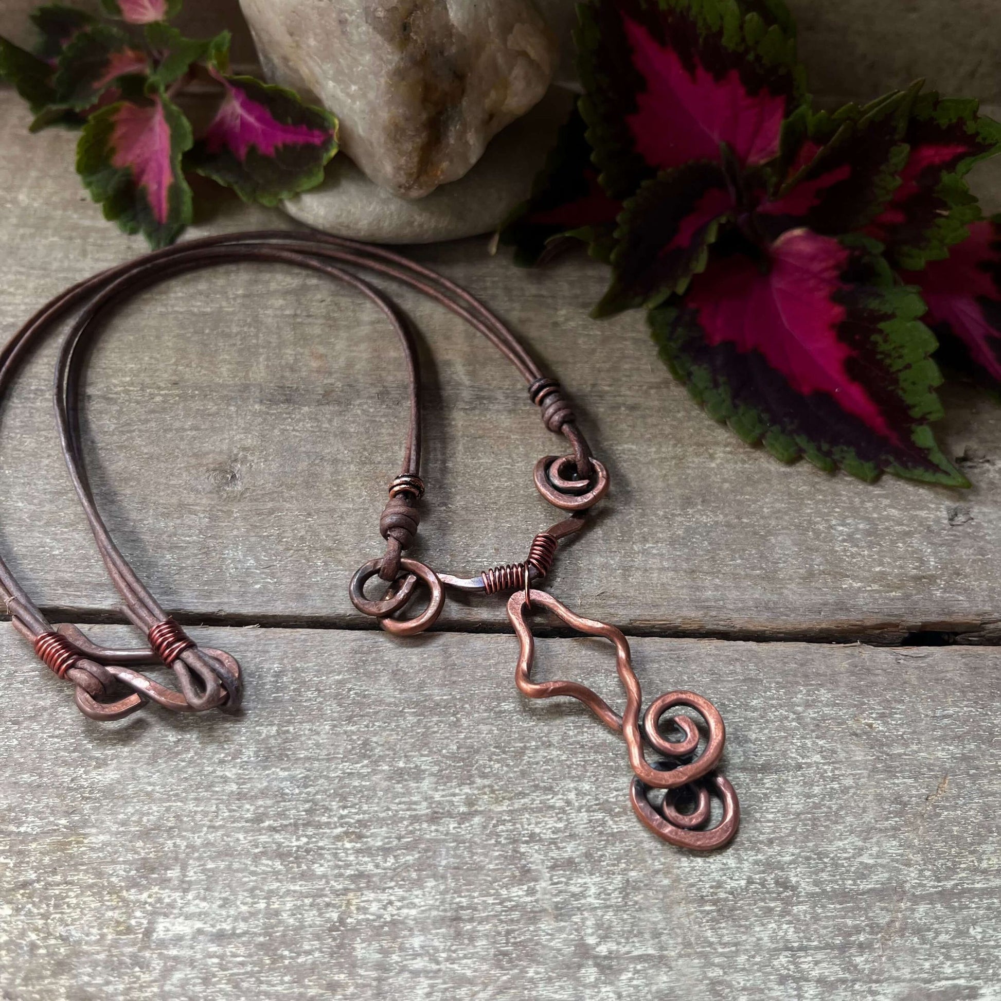 This Chic Hanging Copper Swirl Necklace on Leather will add a little boho flair to your style. Crafted from copper and leather, this unique necklace is definitely one of a kind.