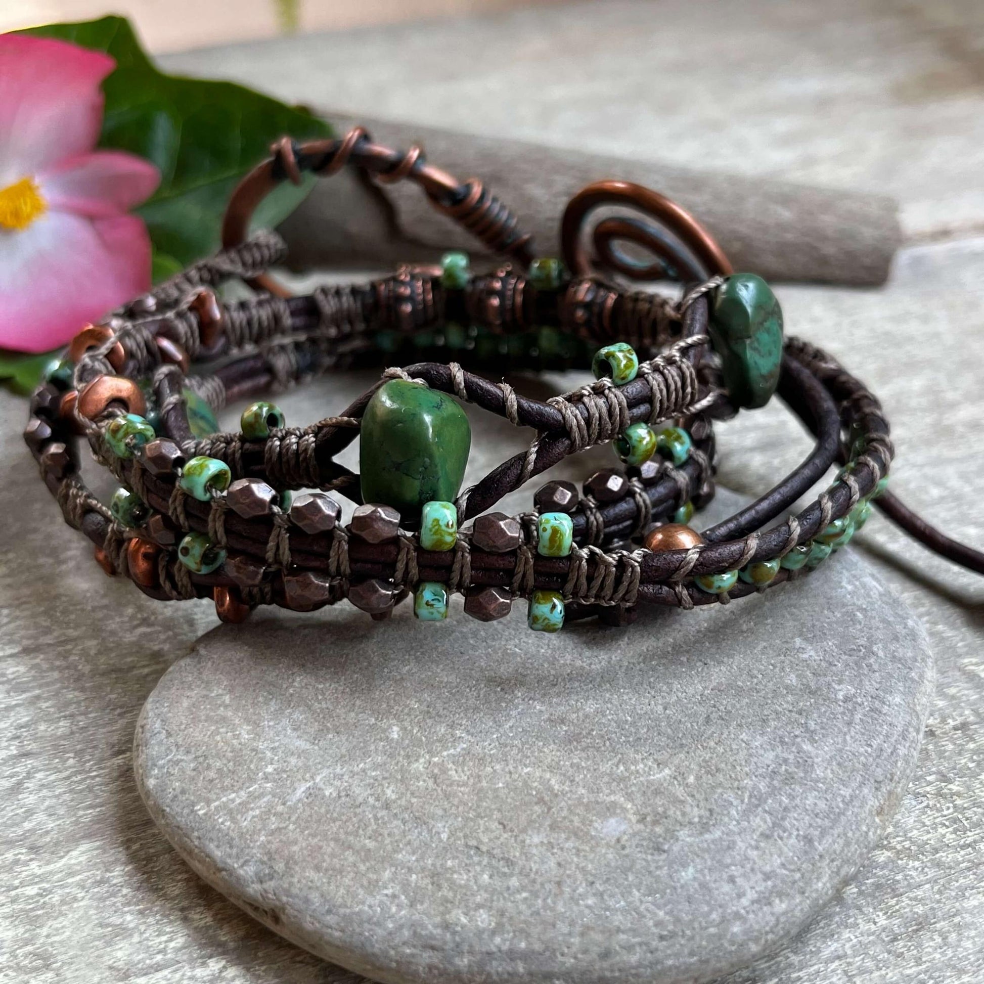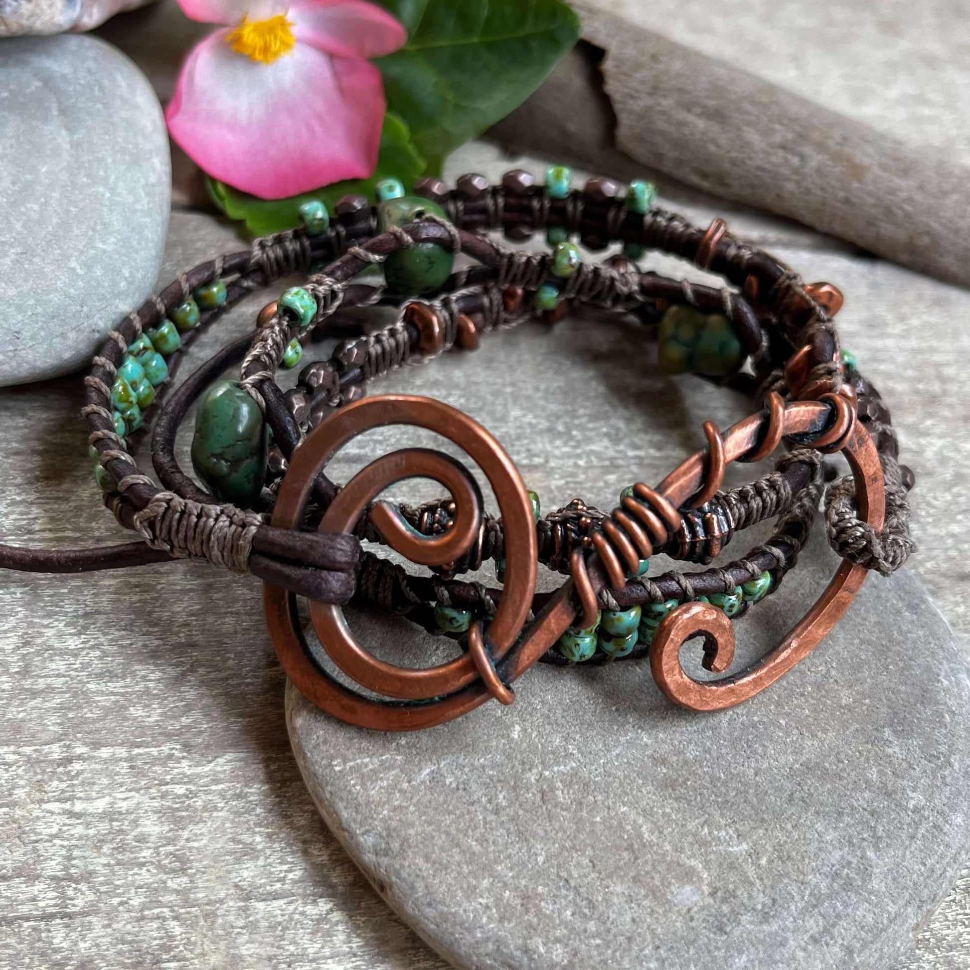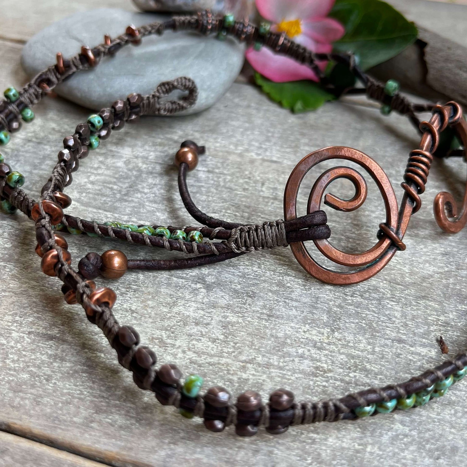 This Triple Wrap Beaded Bracelet combines style and security, perfect for daily wear. It features a 3x wrap beaded bracelet with a unique, handcrafted copper swirl closure. The closure is shaped, hammered, wire-wrapped, and patinaed for a secure and fashionable wear experience.