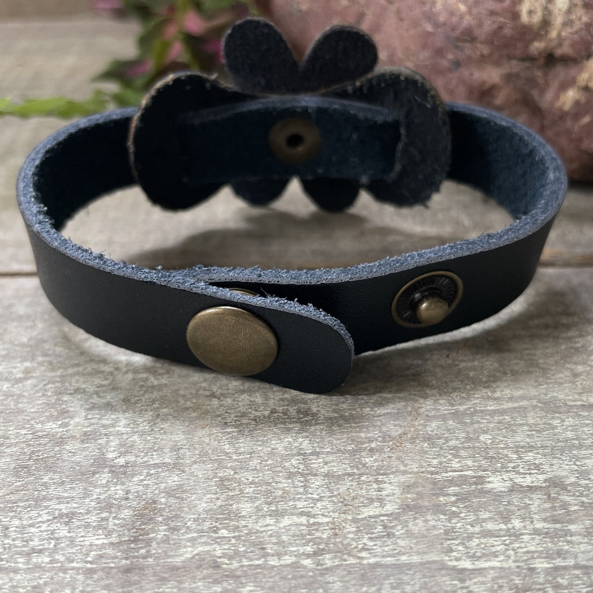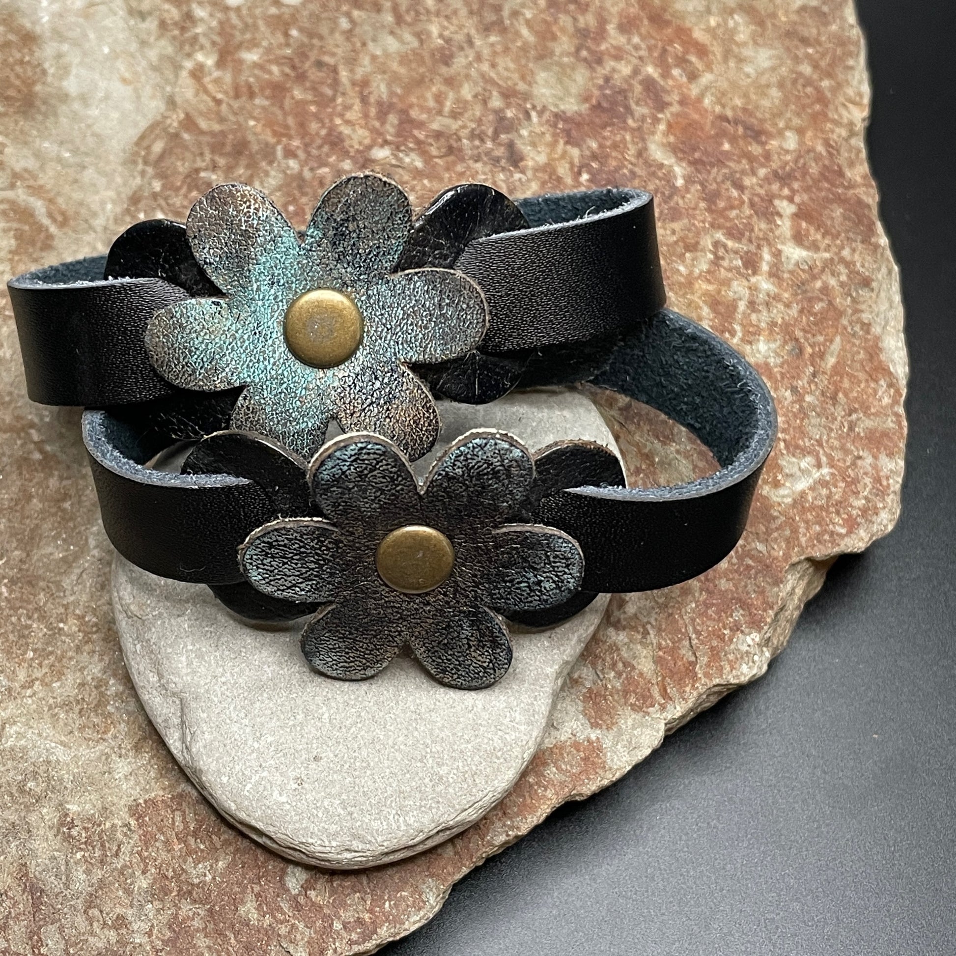 This eye-catching Adjustable Leather Flower Cuff Bracelet showcases charming brass rivets that add a touch of distinctiveness. The flower adornment is fashioned from upcycled materials, including a recycled belt and a pair of vintage leather boots.