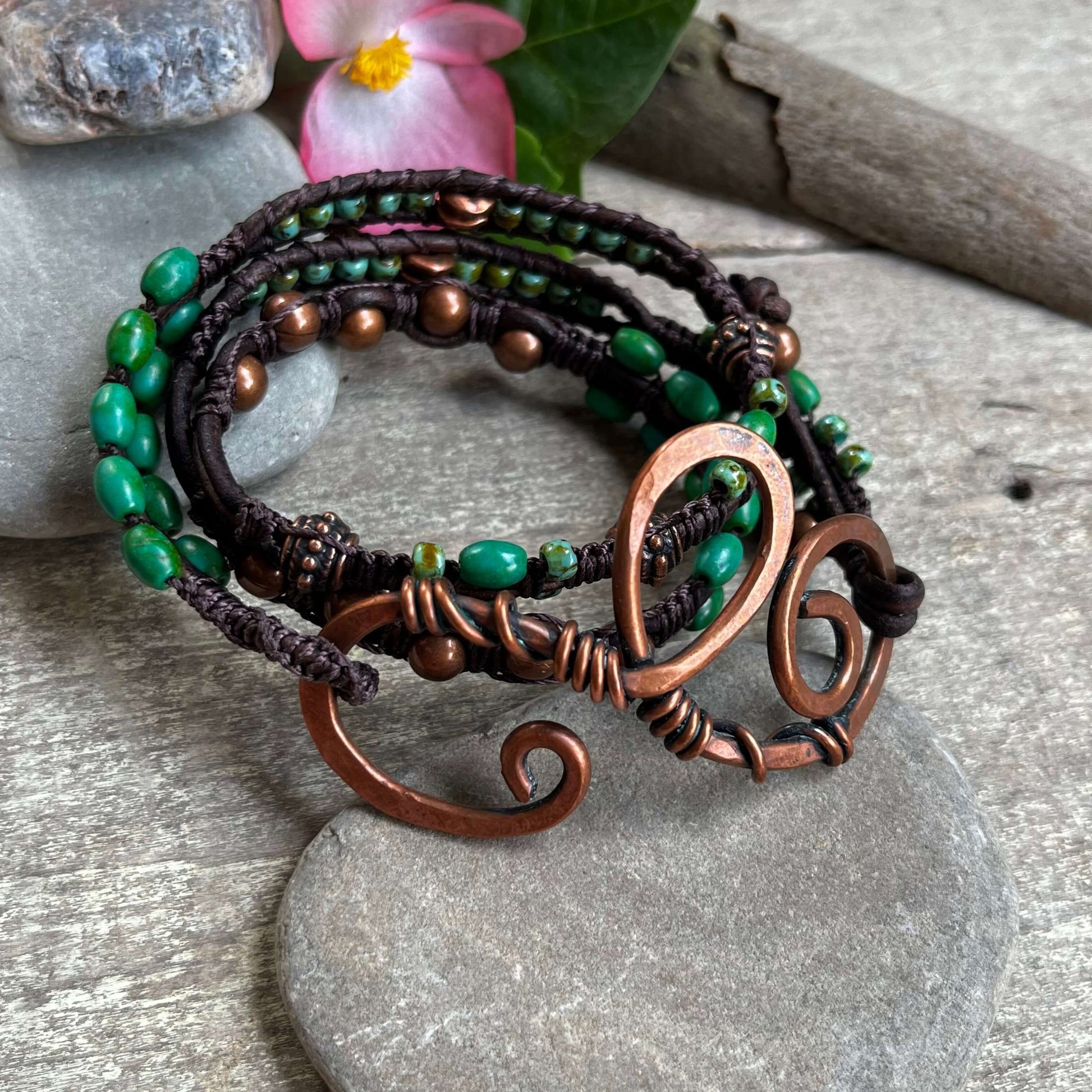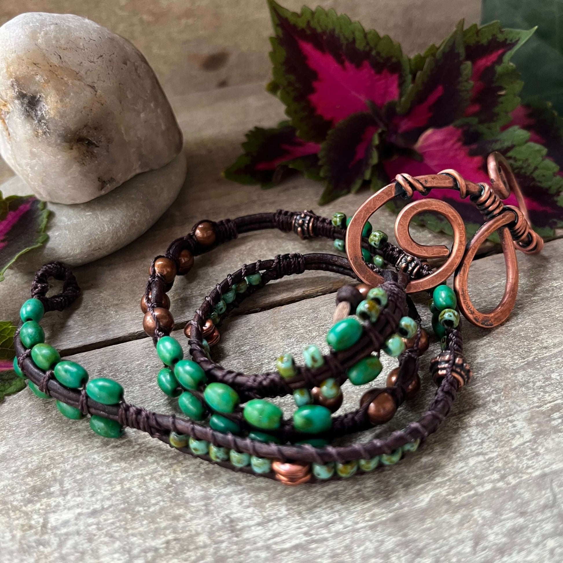 This Triple Wrap Beaded Bracelet combines style and quality, perfect for daily wear. It features a 3x wrap beaded bracelet with glass and gemstone beads with a unique, handcrafted copper swirl closure. The closure is shaped, hammered, wire-wrapped, and patina for a secure and fashionable wear experience.