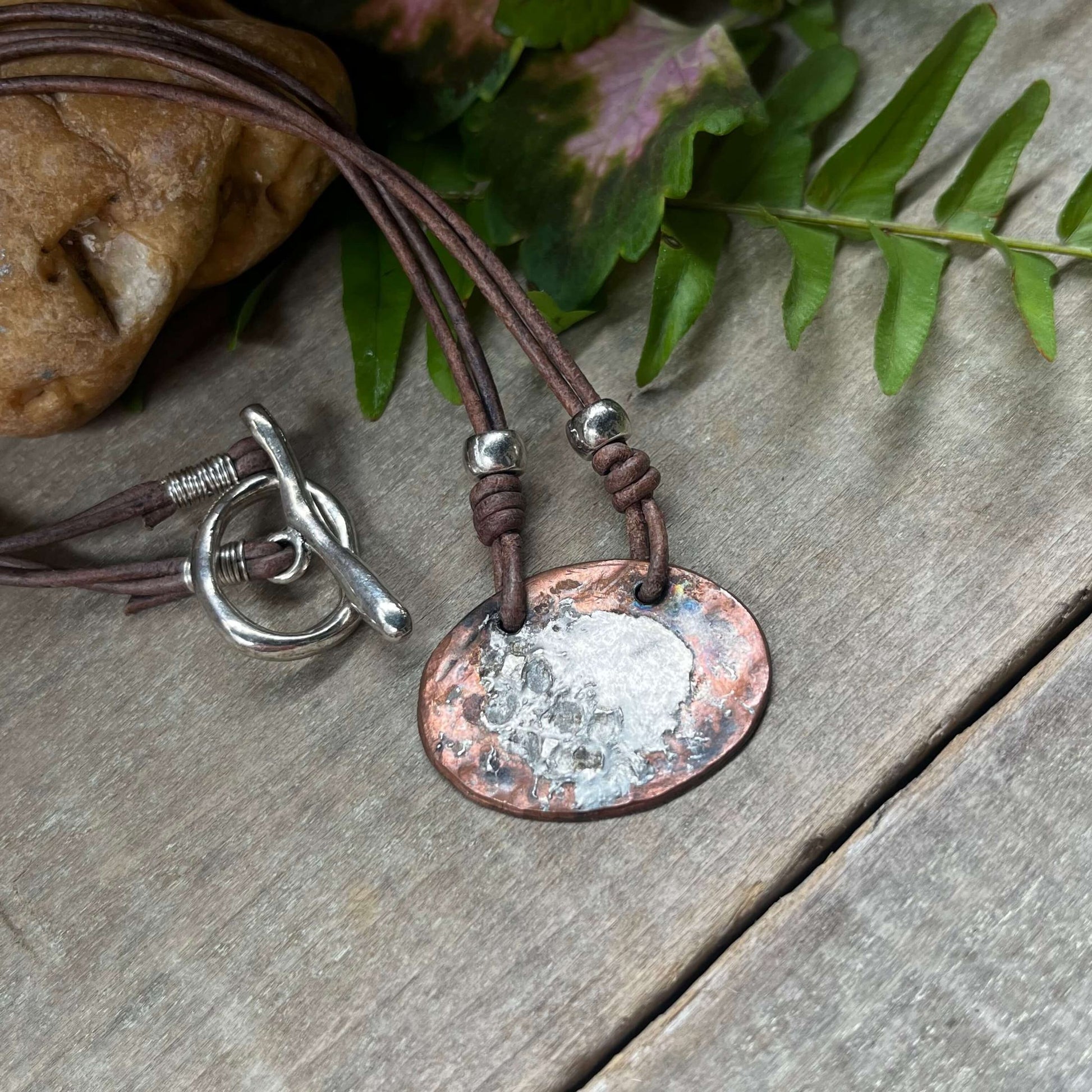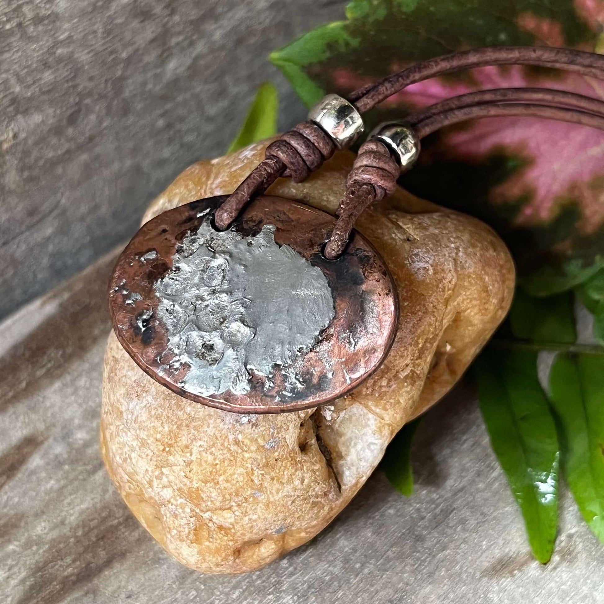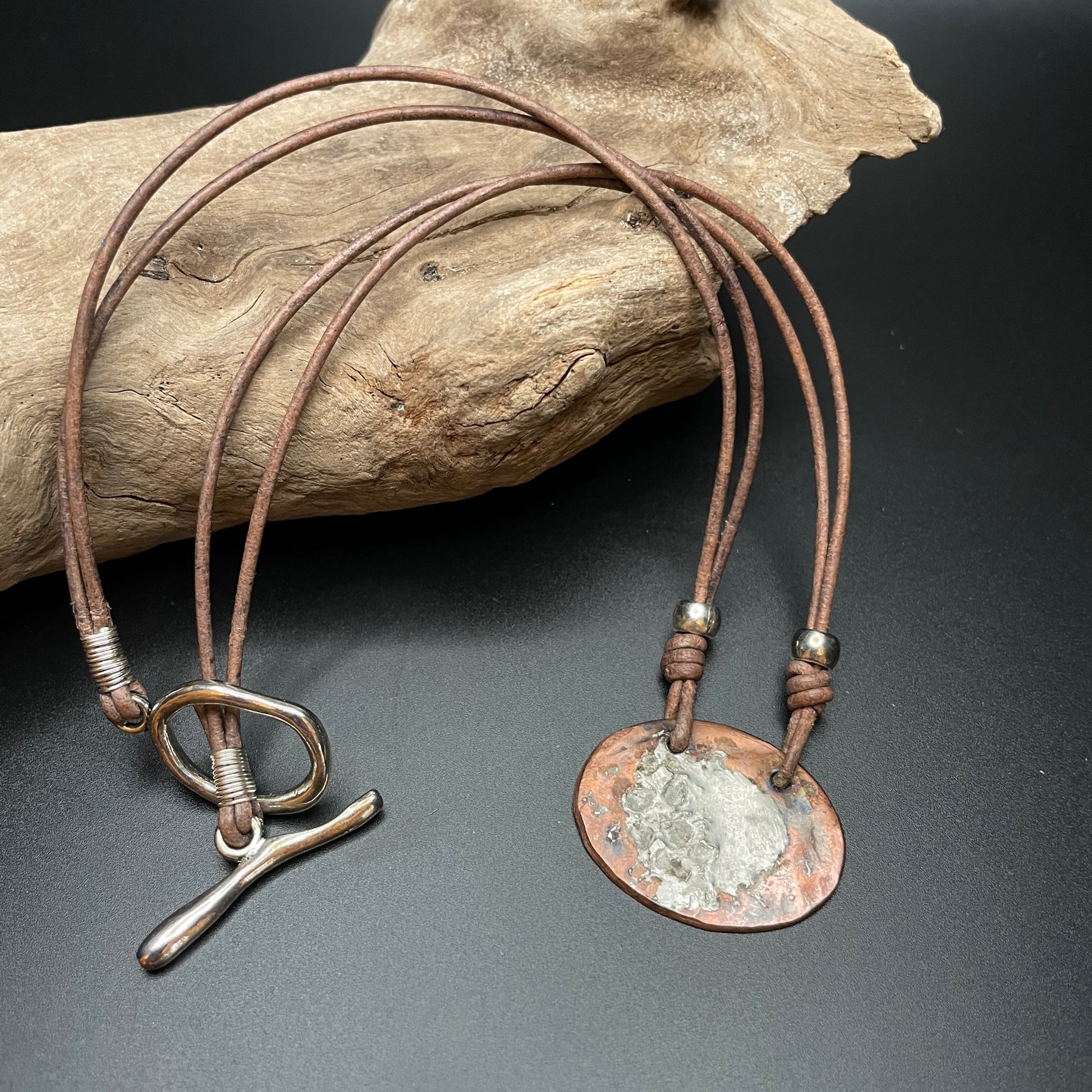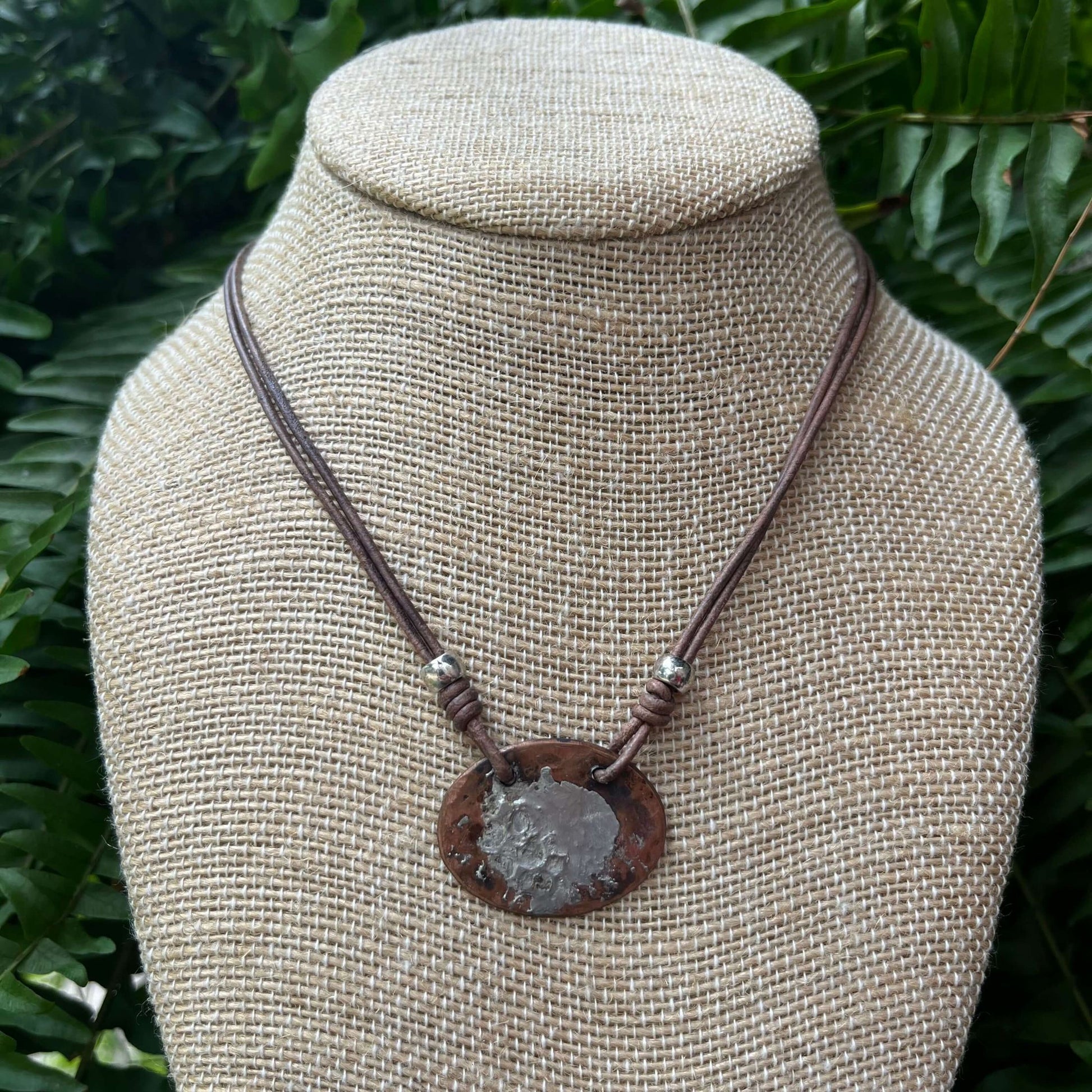 Simple Oval Copper and Silver Solder Necklace on Leather