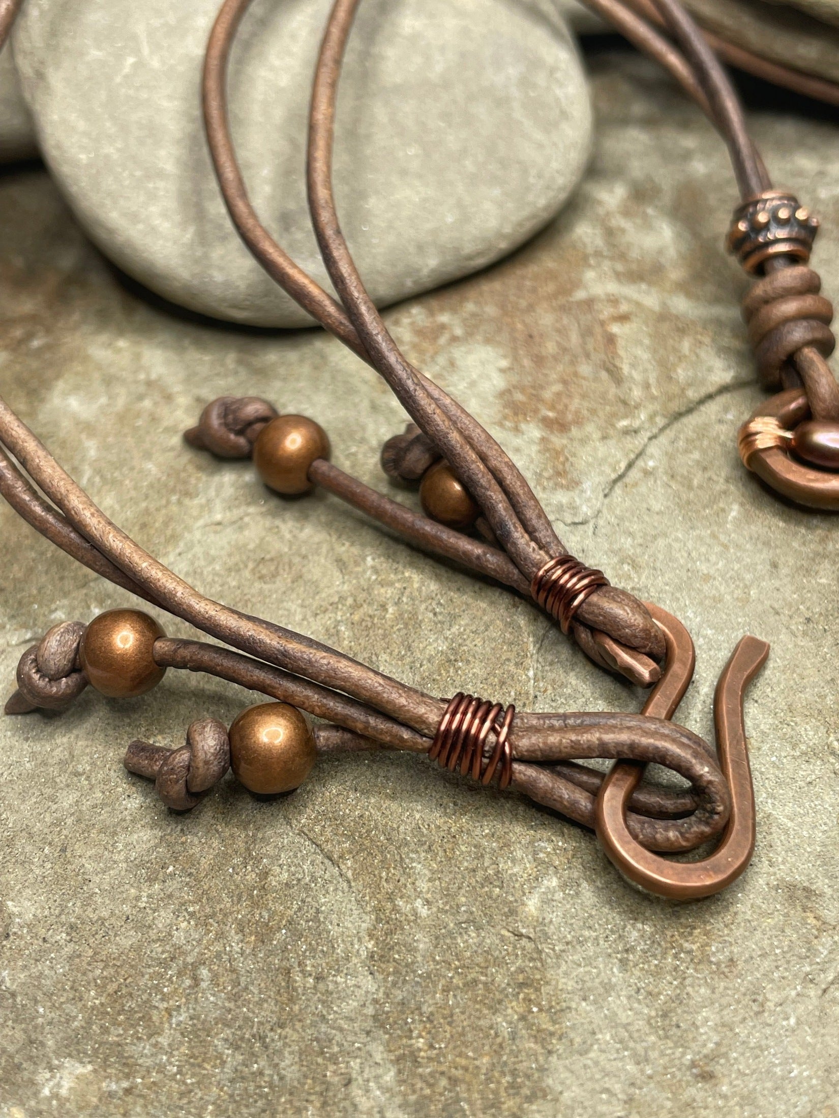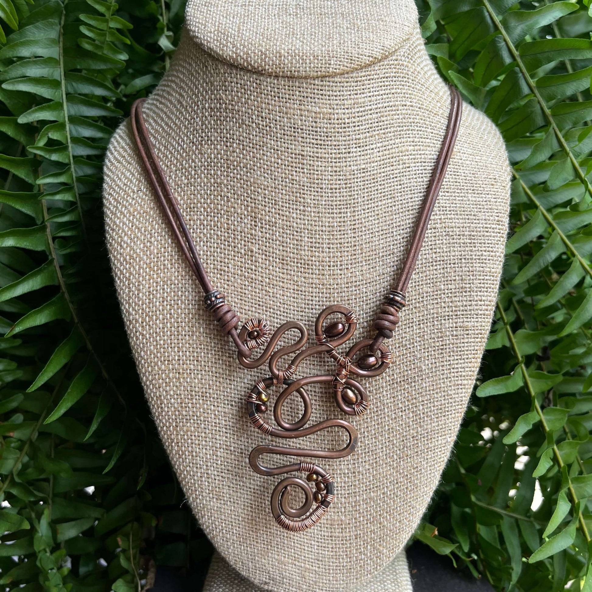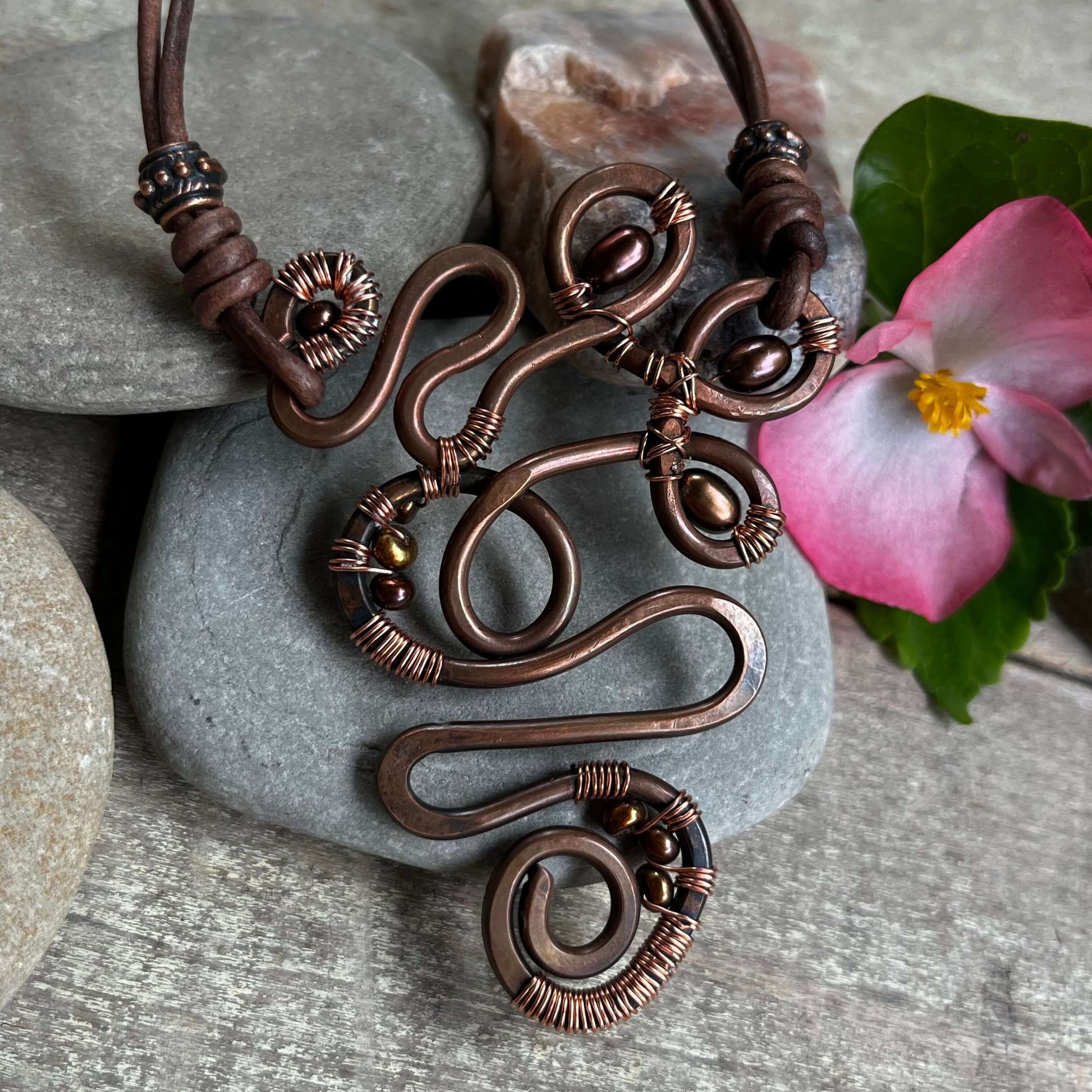 One-of-a-kind copper swirl pendant adorned with genuine pearls on leather. Necklace 20" long and pendant is 2" x 2.5".