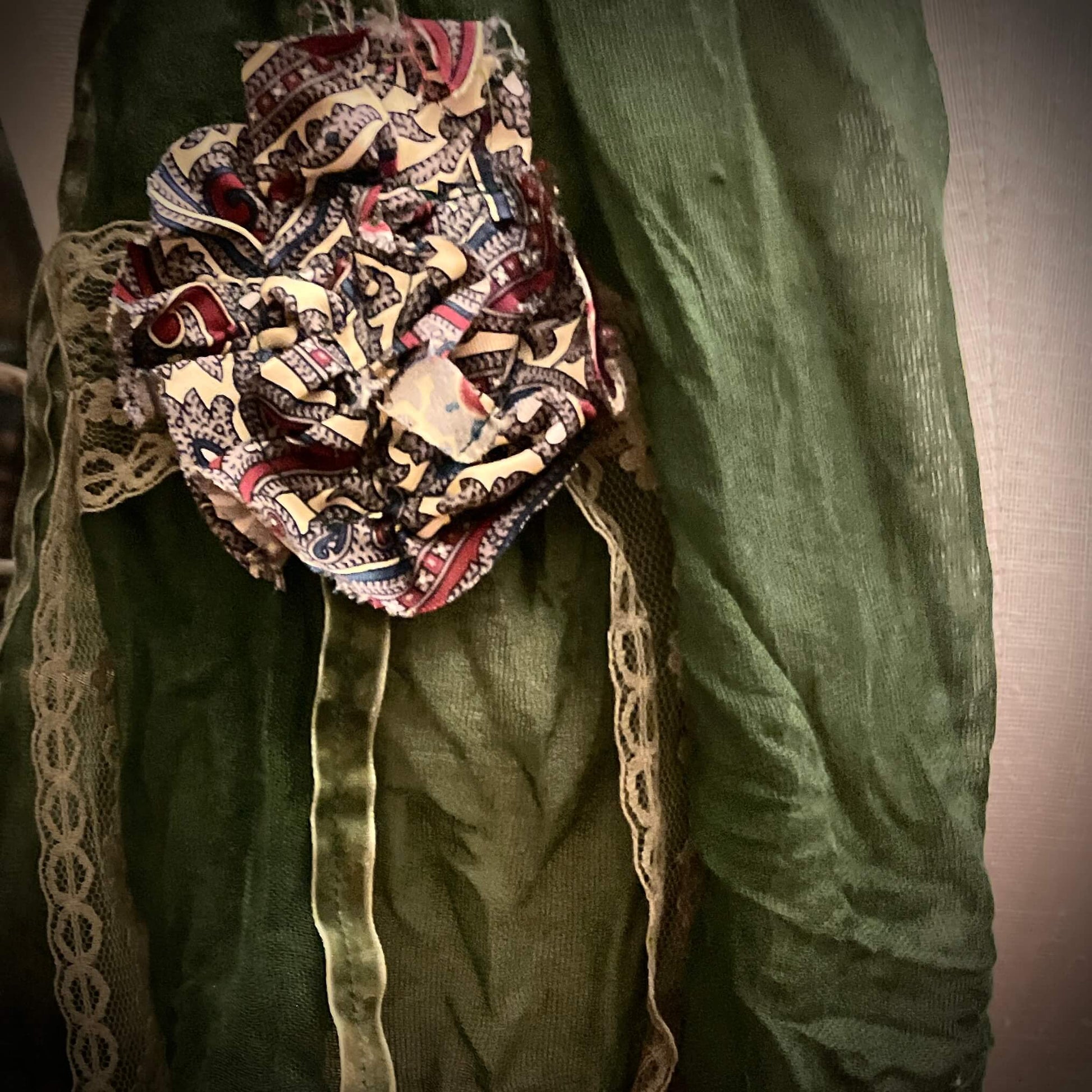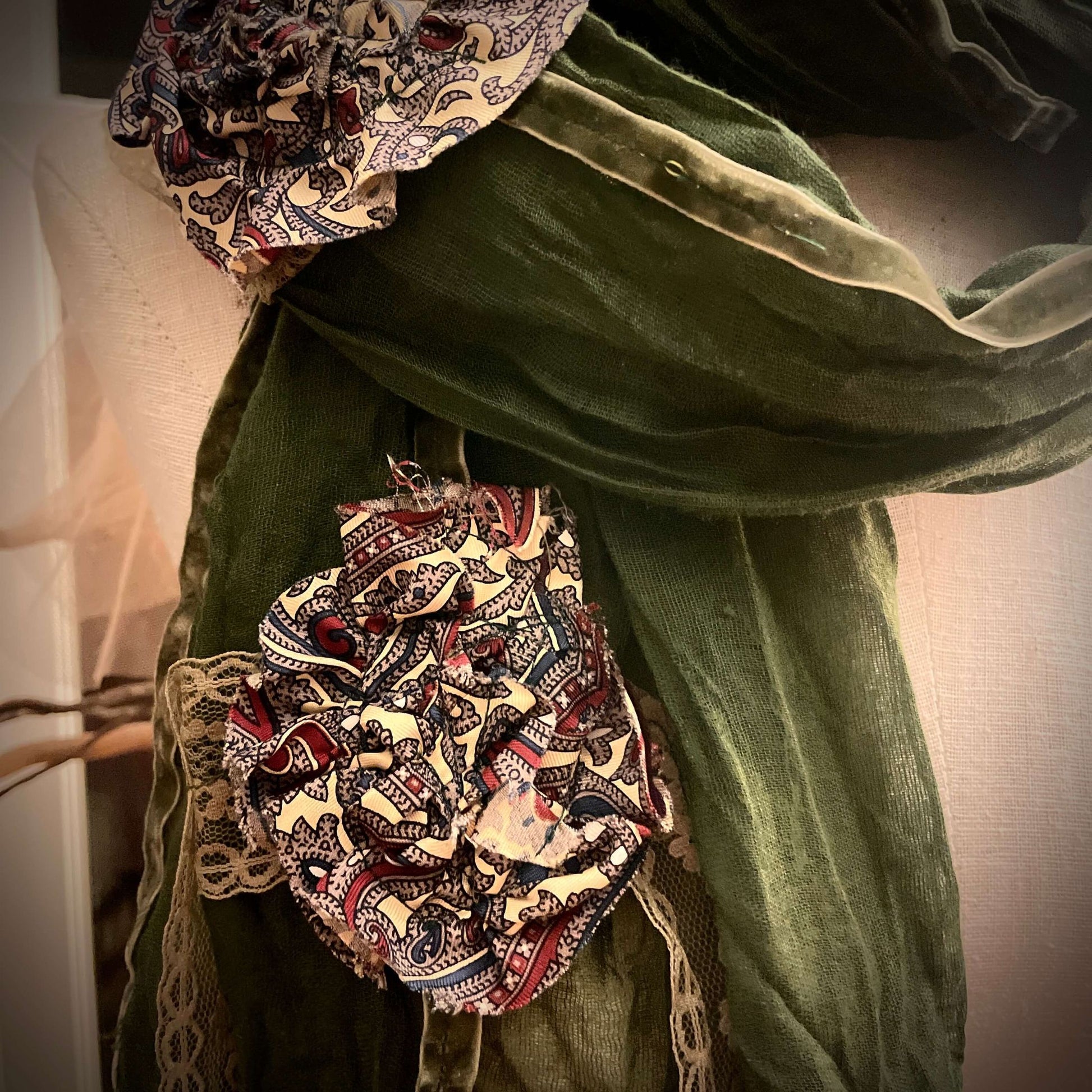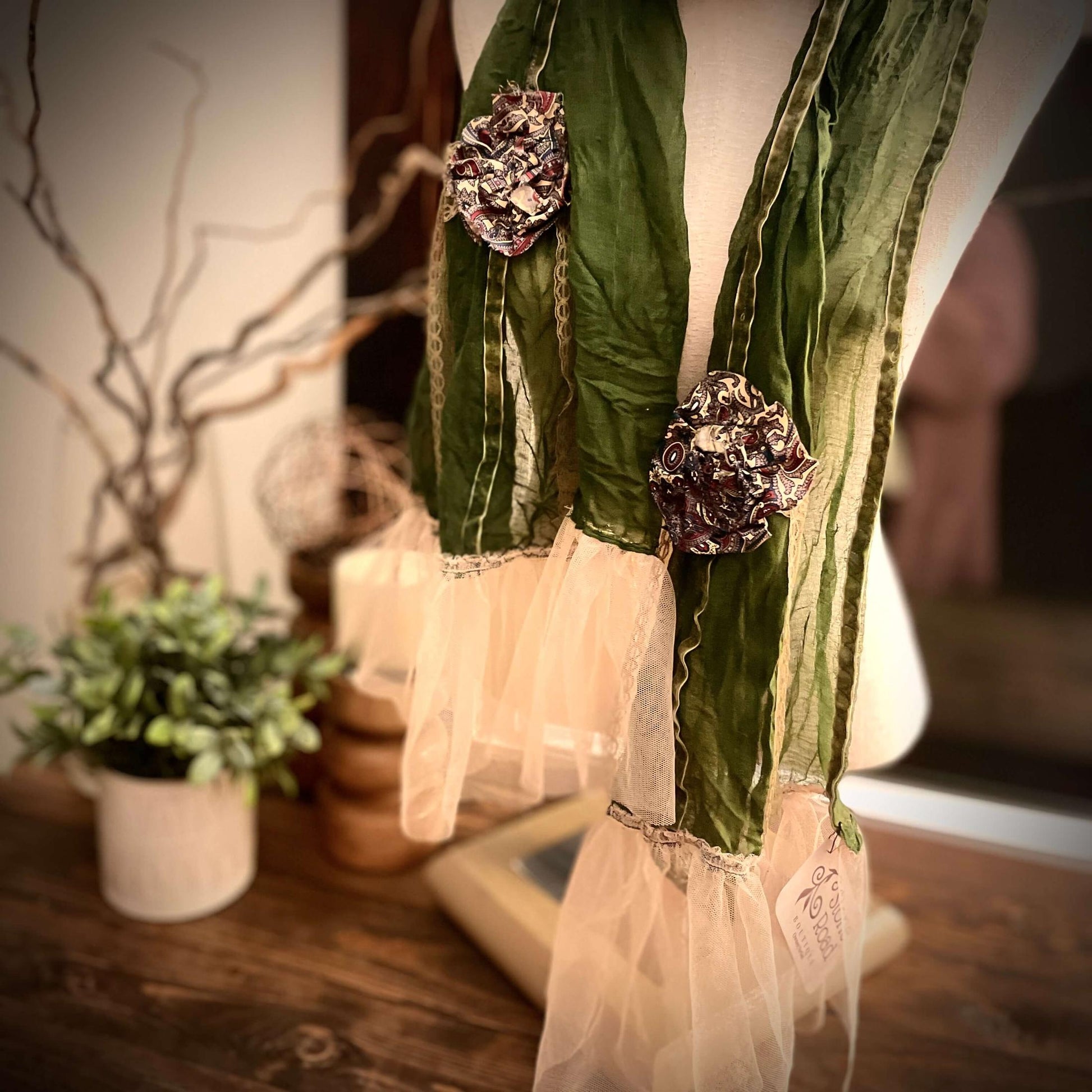 Elevate your everyday style with this lightweight, elegant scarf, designed for year-round wear. Hand-dyed velvet ribbon brings a vintage-inspired charm, echoing timeless fashion. Each scarf is uniquely handcrafted, offering a one-of-a-kind accessory that adds sophistication to any outfit. Pair it with jeans and a white tee for a chic daytime look, or with a simple black dress for an effortless evening look.
