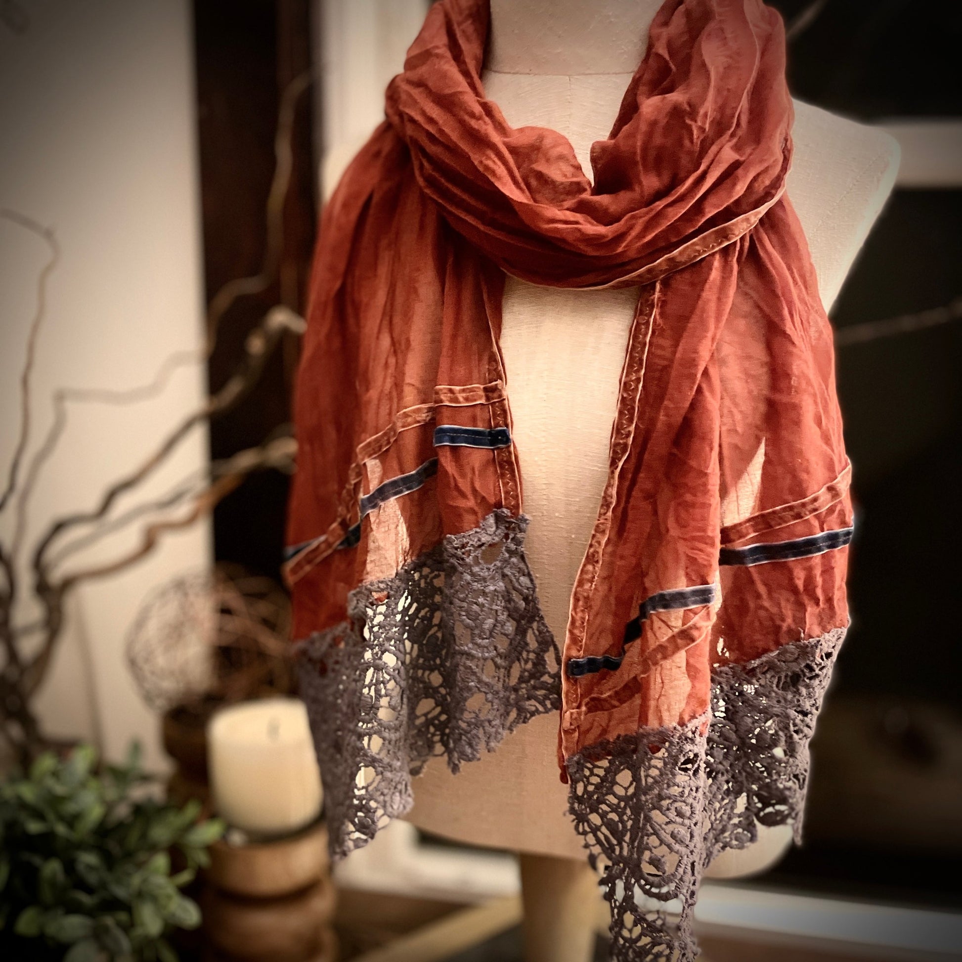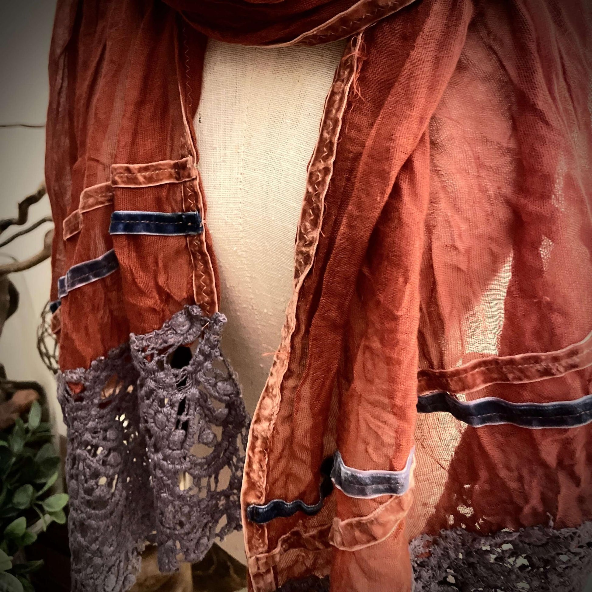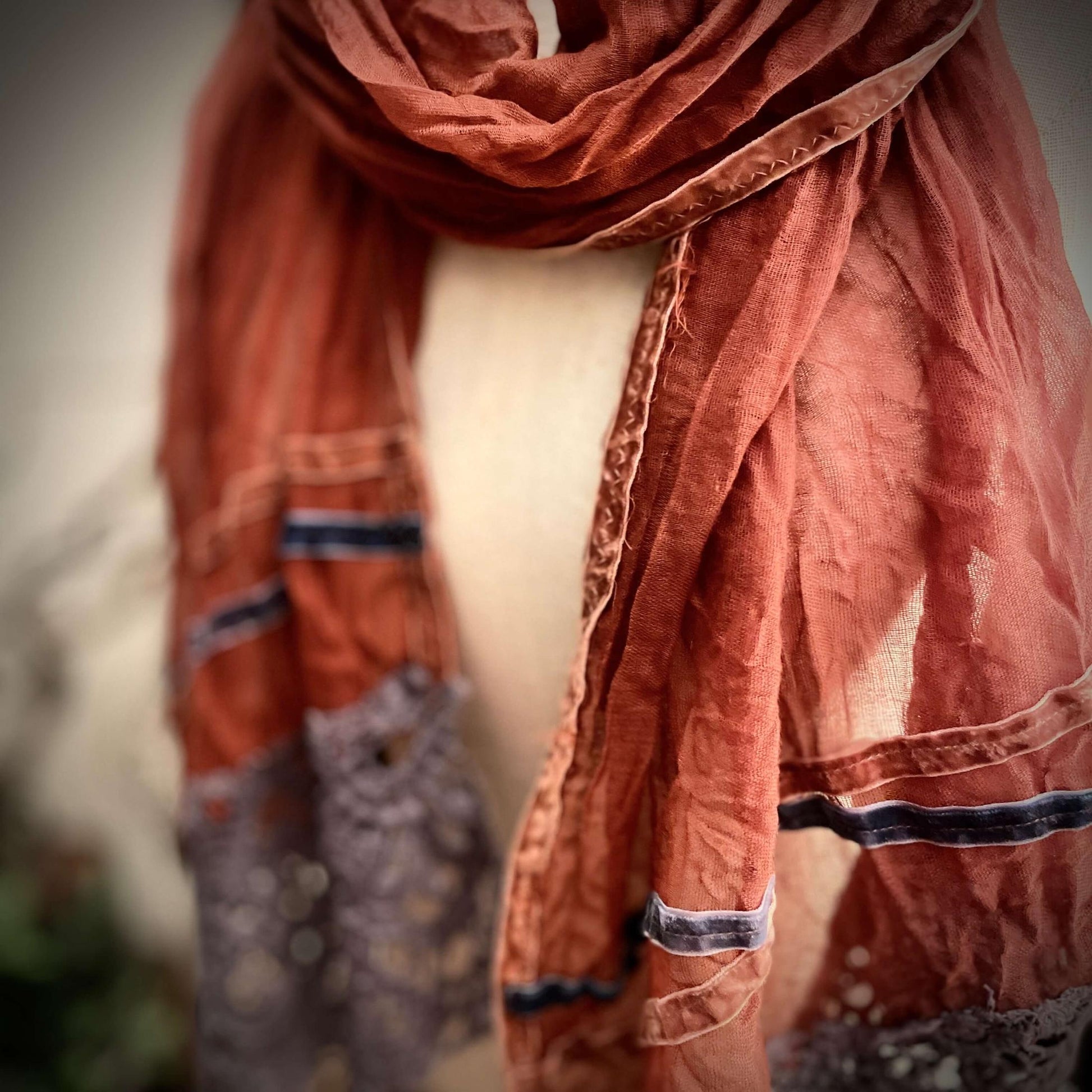 Elevate your everyday style with this lightweight, elegant scarf, designed for year-round wear. Hand-dyed velvet ribbon brings a vintage-inspired charm, echoing timeless fashion. Each scarf is uniquely handcrafted, offering a one-of-a-kind accessory that adds sophistication to any outfit. Pair it with jeans and a white tee for a chic daytime look, or with a simple black dress for an effortless evening look.